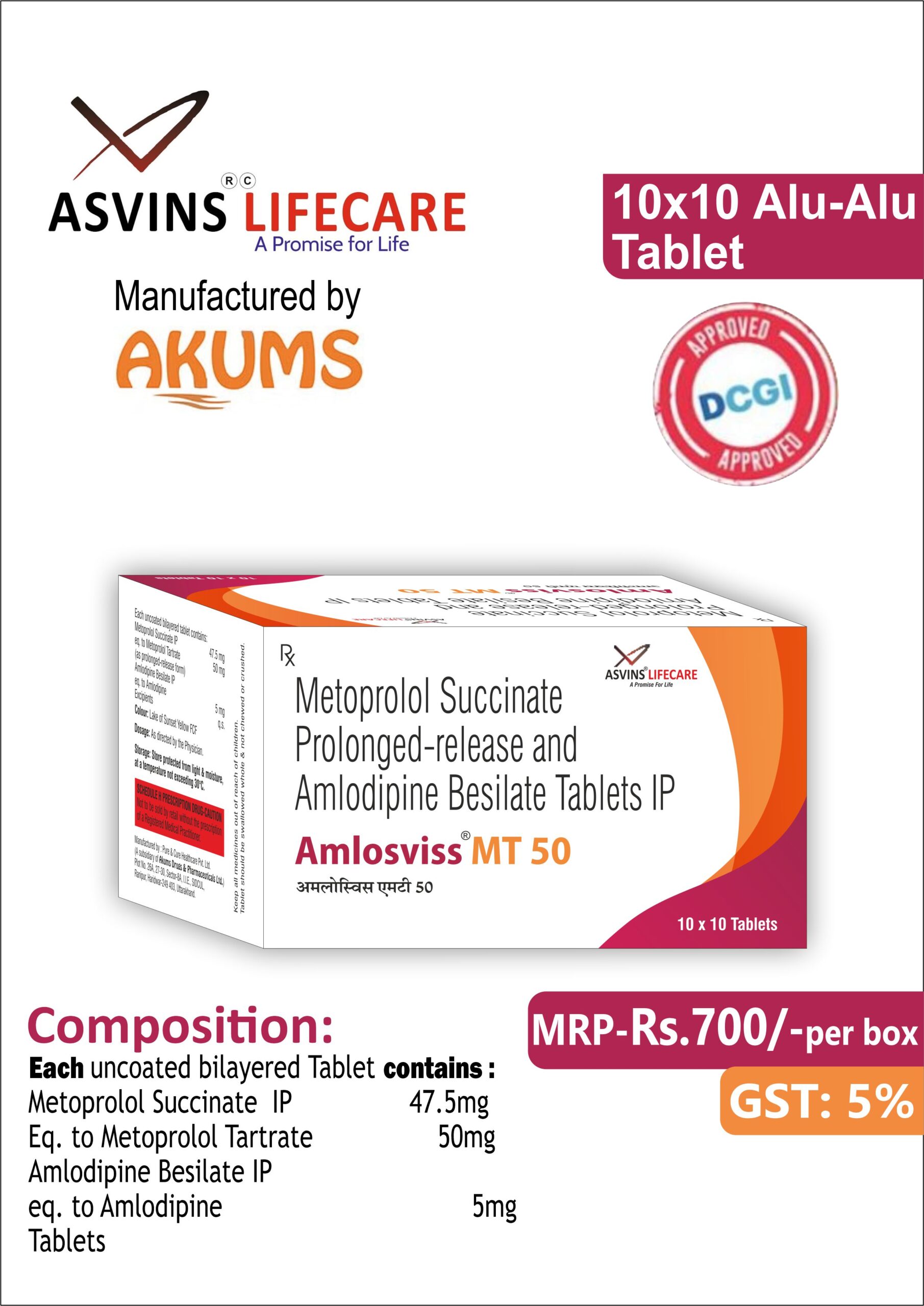 Metoprolol Succinate IP 47.5mg Eq. to Metoprolol Tartrate 50mg+Amlodipine Besilate IP 5mg