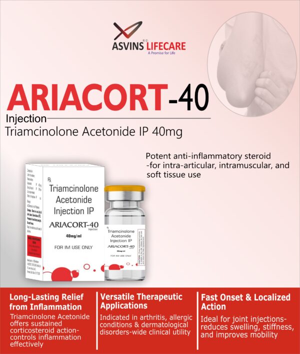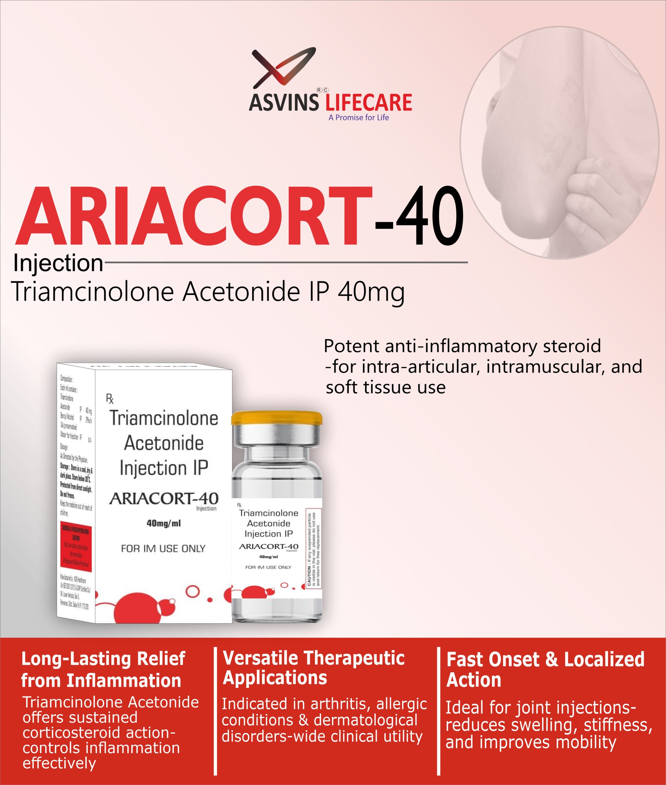 Triamcinolone Acetonide IP 40mg+Benzyl Alcohol IP 2% v/v Injection – ARIACORT-40 has a medicine called Triamcinolone Acetonide and contains Benzyl Alcohol, which is used for serious allergic reactions and joint problems related to rheumatism. It helps with allergy signs like a runny nose, sneezing, and itchy eyes, nose, and throat. Allergic rhinitis is when the nose gets irritated and allergic because of things like pollen, dust, mold, or skin flakes from some animals. Triamcinolone Acetonide is a type of steroid that helps reduce inflammation (redness and swelling) and allergies by stopping the body from making some chemicals that cause these problems.