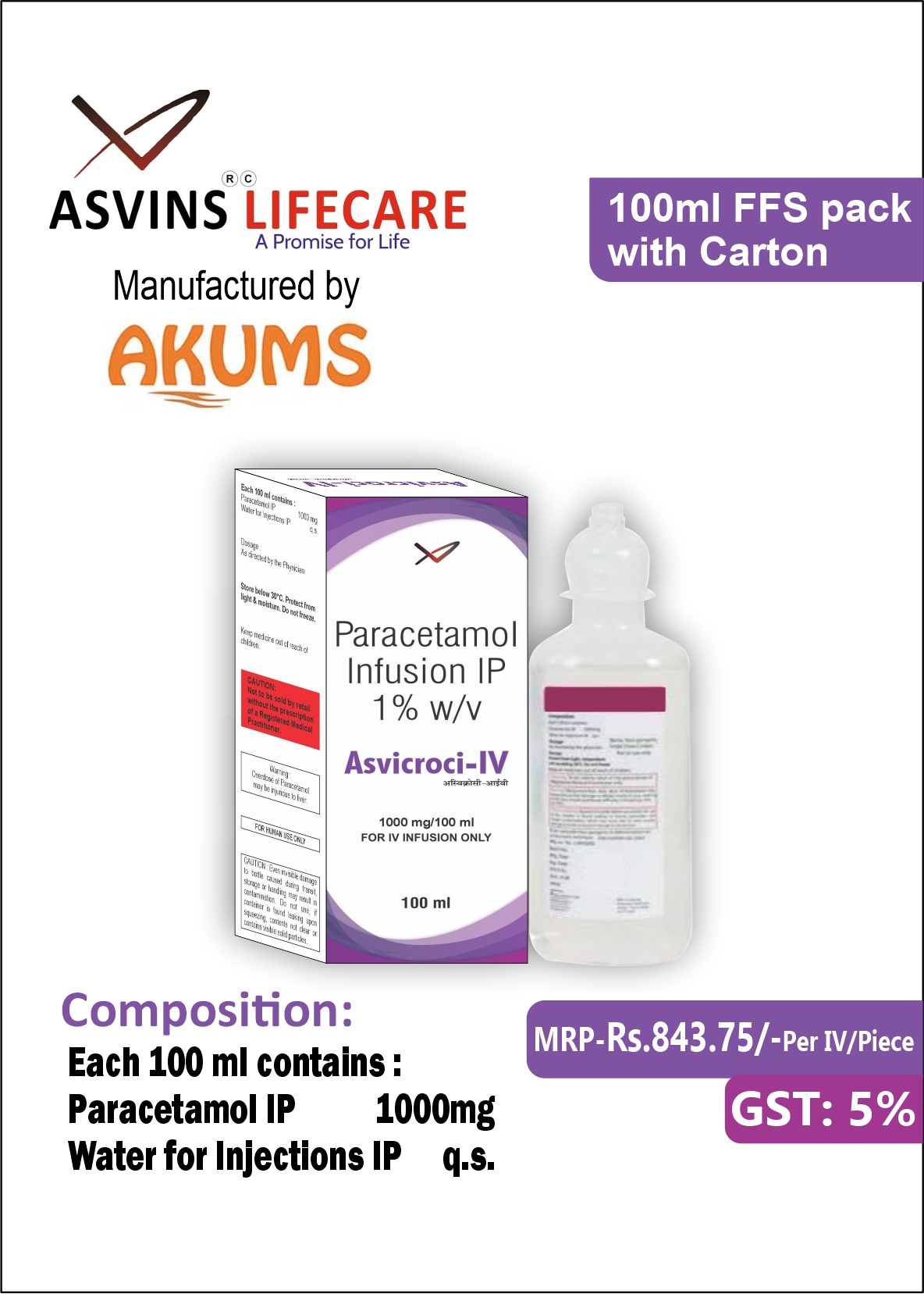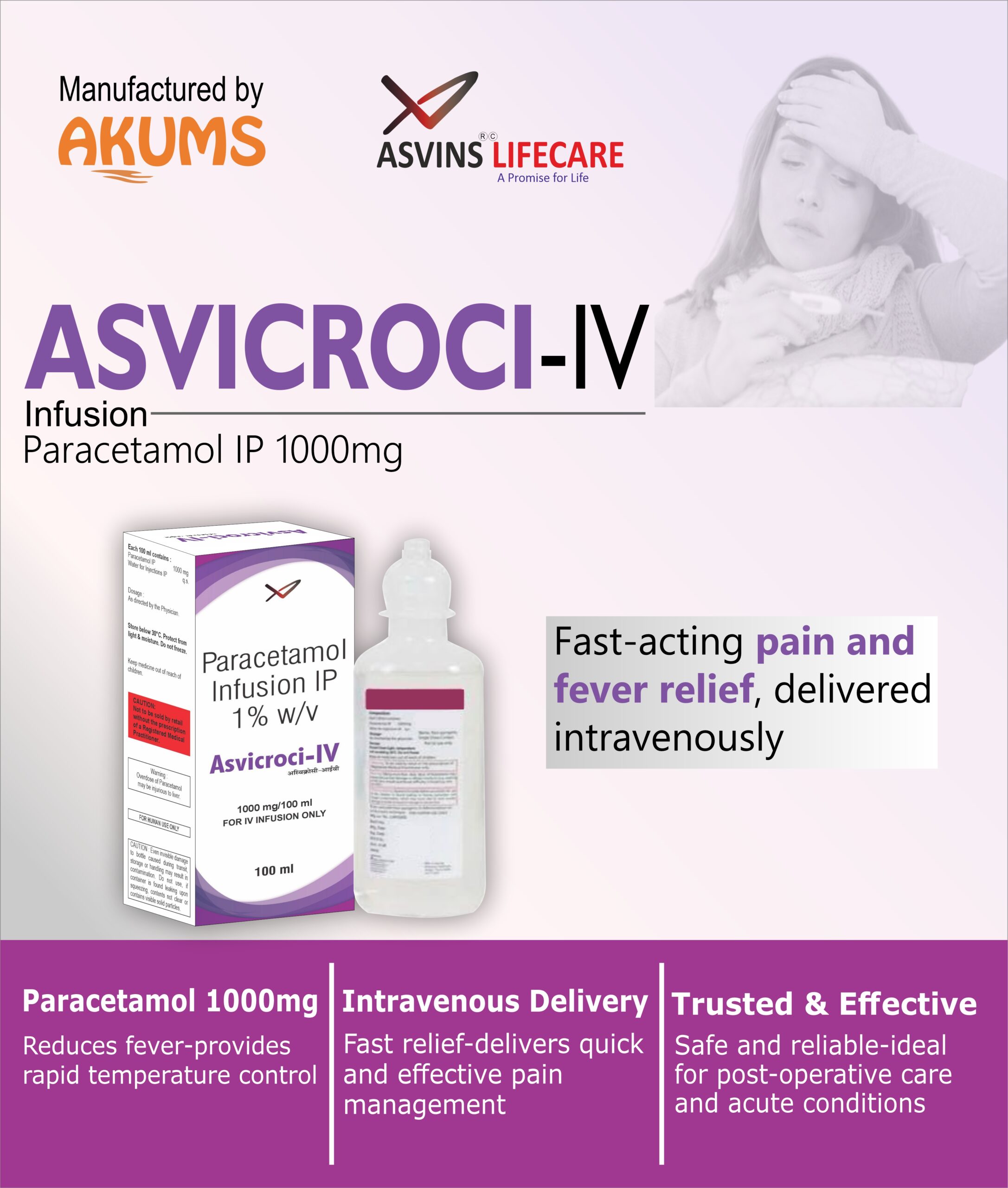 • Paracetamol IP 1000mg infusion is used for a short time in the treatment of moderate pain and fever, especially arising after surgery.