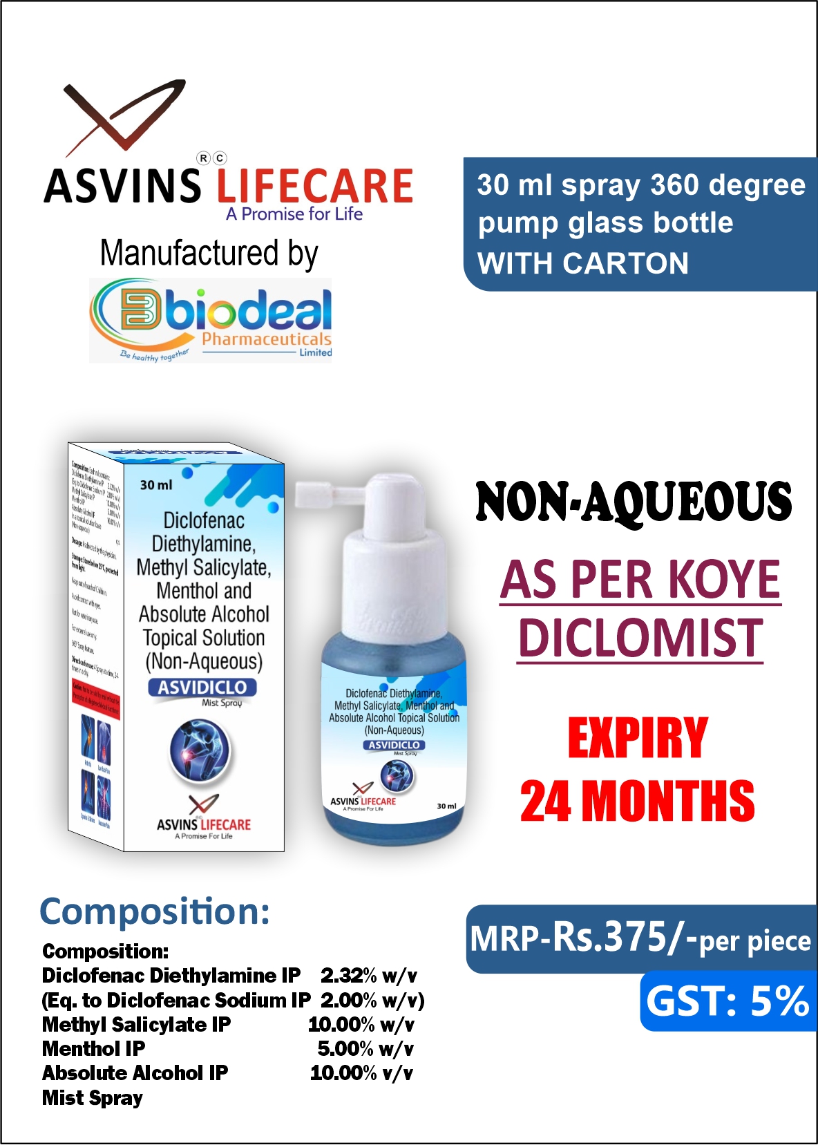 Diclofenac Diethylamine IP 2.32%w/v+Methyl Salicylate IP 10.00%w/v +Menthol IP 5.00%w/v+Absolute Alcohol IP 10.00%v/v Mist Spray