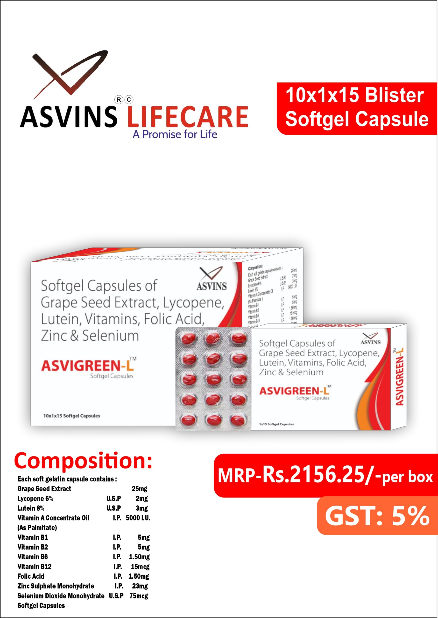 Grape Seed Extract 25 mg+Lycopene 6% USP 2 mg + Lutein 8% USP 3 mg + Vitamin A Concentrate OIl IP (As Palmitate) 5000 I.U.+Vitamin B1 IP 5 mg + Vitamin B2 IP 5 mg+Vitamin B6 IP 1.50 mg + Vitamin B12 IP 15 mcg+Folic Acid IP 1.50 mg + Zinc SulphateMonohydrate IP 23 mg + Selenium Dioxide Monohydrate IP 75 mcg Softgel Capsules