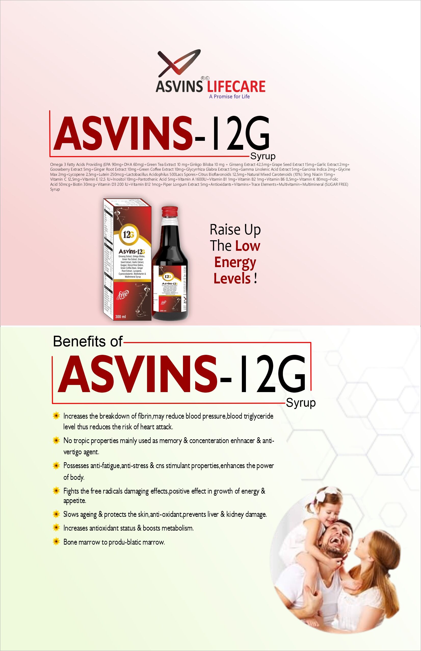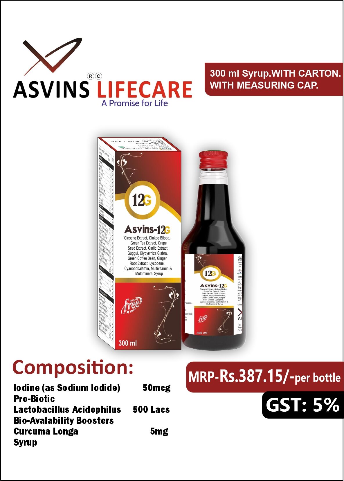 “Omega-3 Fatty Acids providing EPA 90 mg + DHA 60 mg, Green Tea Extract 10 mg, Ginkgo Biloba 10 mg, Ginseng Extract 42.5 mg, Grape Seed Extract 15 mg, Garlic Extract 2 mg, Gooseberry Extract 5 mg, Ginger Root Extract 10 mg, Green Coffee Extract 10 mg, Glycyrrhiza Glabra Extract 5 mg, Gamma Linolenic Acid Extract 5 mg, Garcinia Indica 2 mg, Glycine Max 2 mg, Lycopene 2.5 mg, Lutein 250 mcg, Lactobacillus Acidophilus 500 lacs spores, Citrus Bioflavonoids 12.5 mg, Natural Mixed Carotenoids (10%) 5 mg, Niacin 15 mg, Vitamin C 12.5 mg, Vitamin E 12.5 IU, Inositol 10 mg, Pantothenic Acid 5 mg, Vitamin A 1600 IU, Vitamin B1 1 mg, Vitamin B2 1 mg, Vitamin B6 0.5 mg, Vitamin K 80 mcg, Folic Acid 50 mcg, Biotin 30 mcg, Vitamin D3 200 IU, Vitamin B12 1 mcg, Piper Longum Extract 5 mg, Antioxidants, Vitamins, Trace Elements, Multivitamins, and Multiminerals (Sugar-Free Syrup)