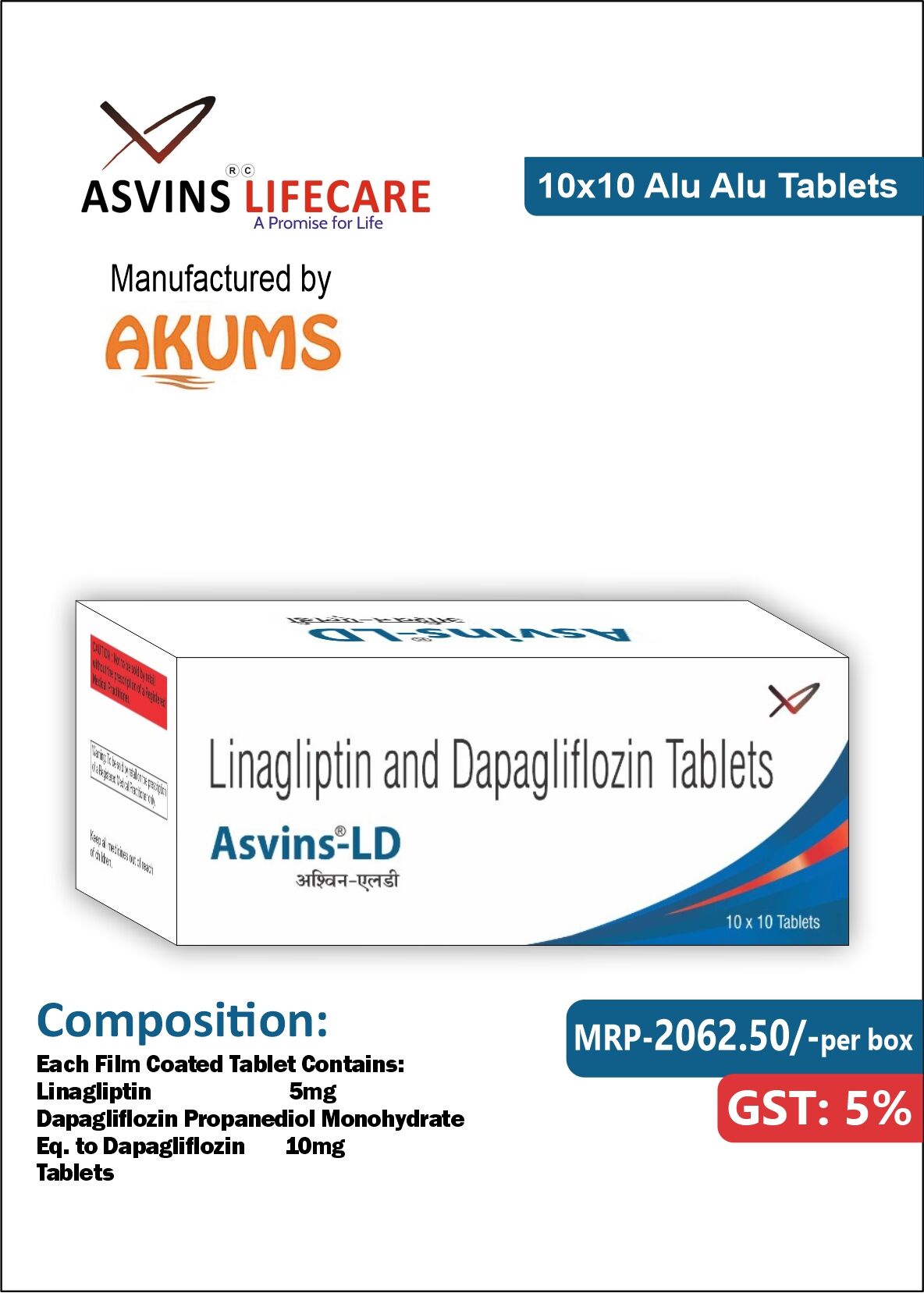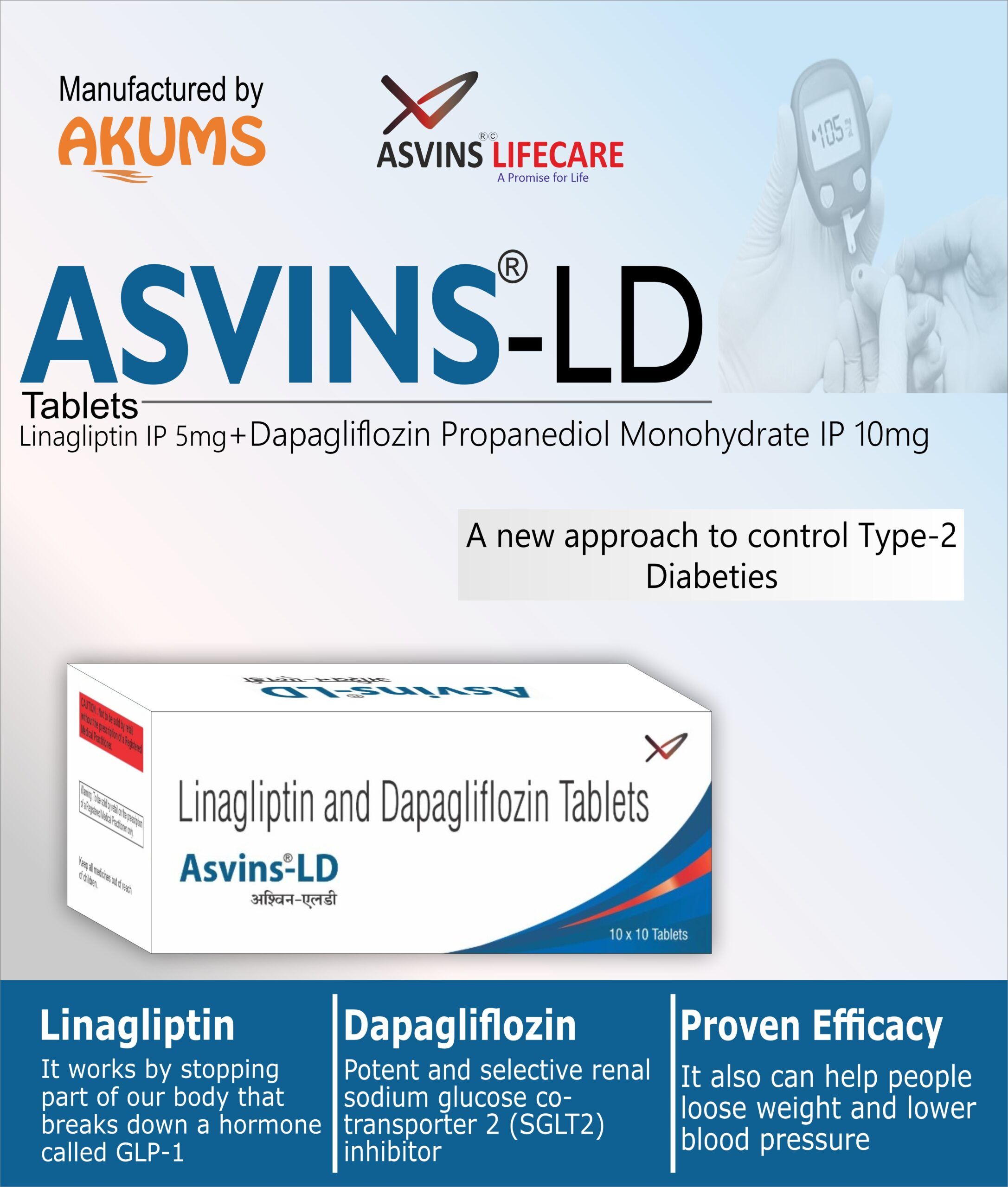 You can take Dapagliflozin + Linagliptin tablet at any time of day but try to take it at the same time each day. Gulp the medicine whole with a drink of water. Do not chew them. You can take Asvins-LD medicine with or without food.