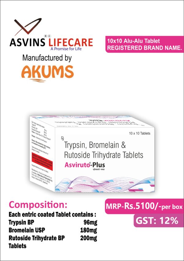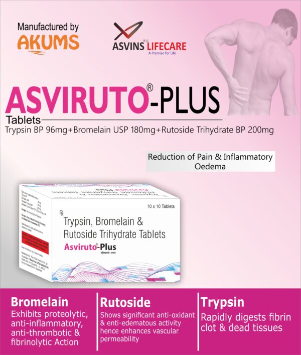 Trypsin, Bromelain & Rutoside Tablets – Asviruto Plus is used to treat musculoskeletal pain in the conditions of osteoarthritis, rheumatoid arthritis, and ankylosing spondylitis. Pain is caused by the damage to the tissues of the muscle, bone, or other organs of the body for a short time or a long time.