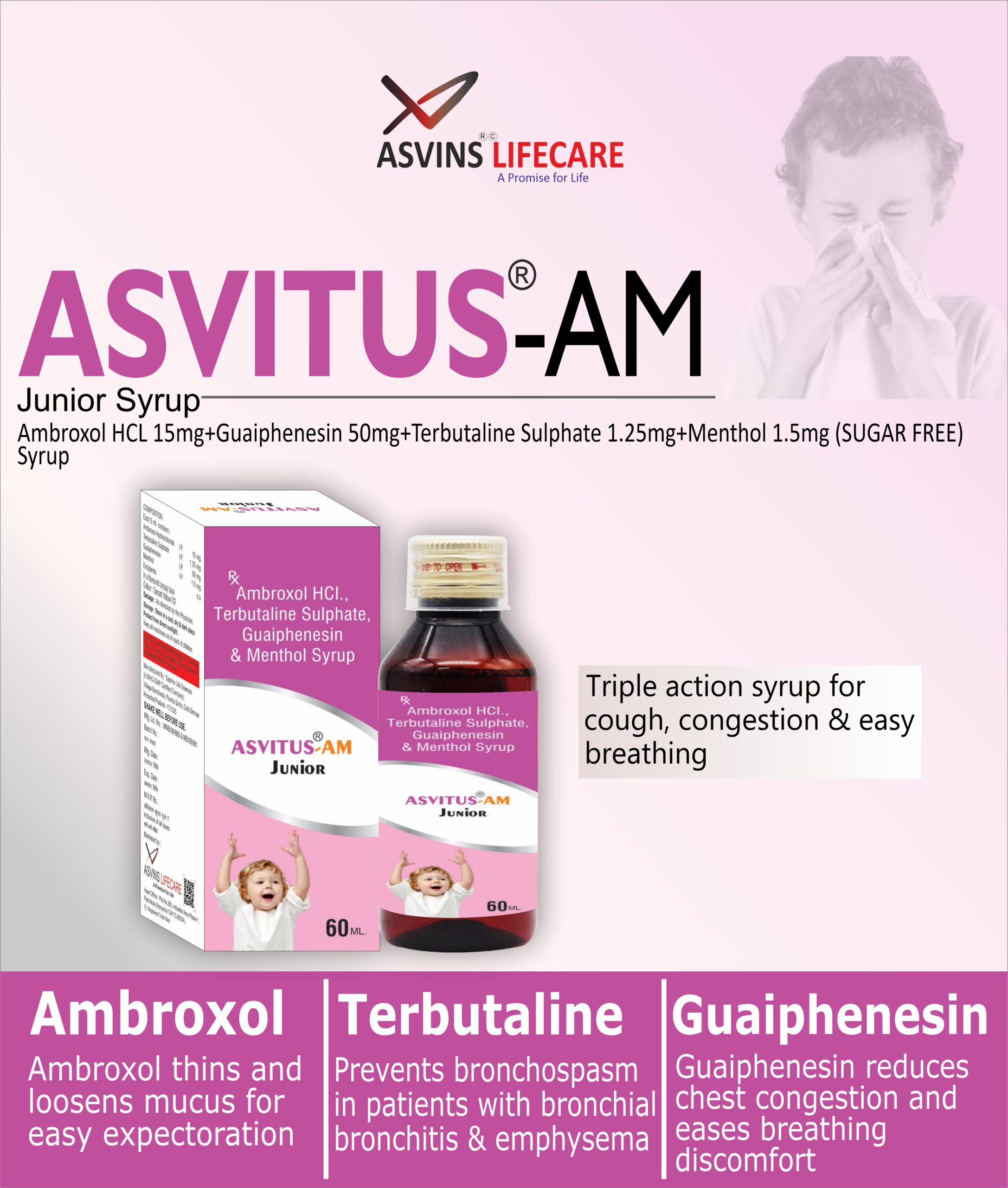 Ambroxol HCL 15mg+Guaiphenesin 50mg+Terbutaline Sulphate 1.25mg+Menthol 1.5mg (SUGAR FREE) Syrup