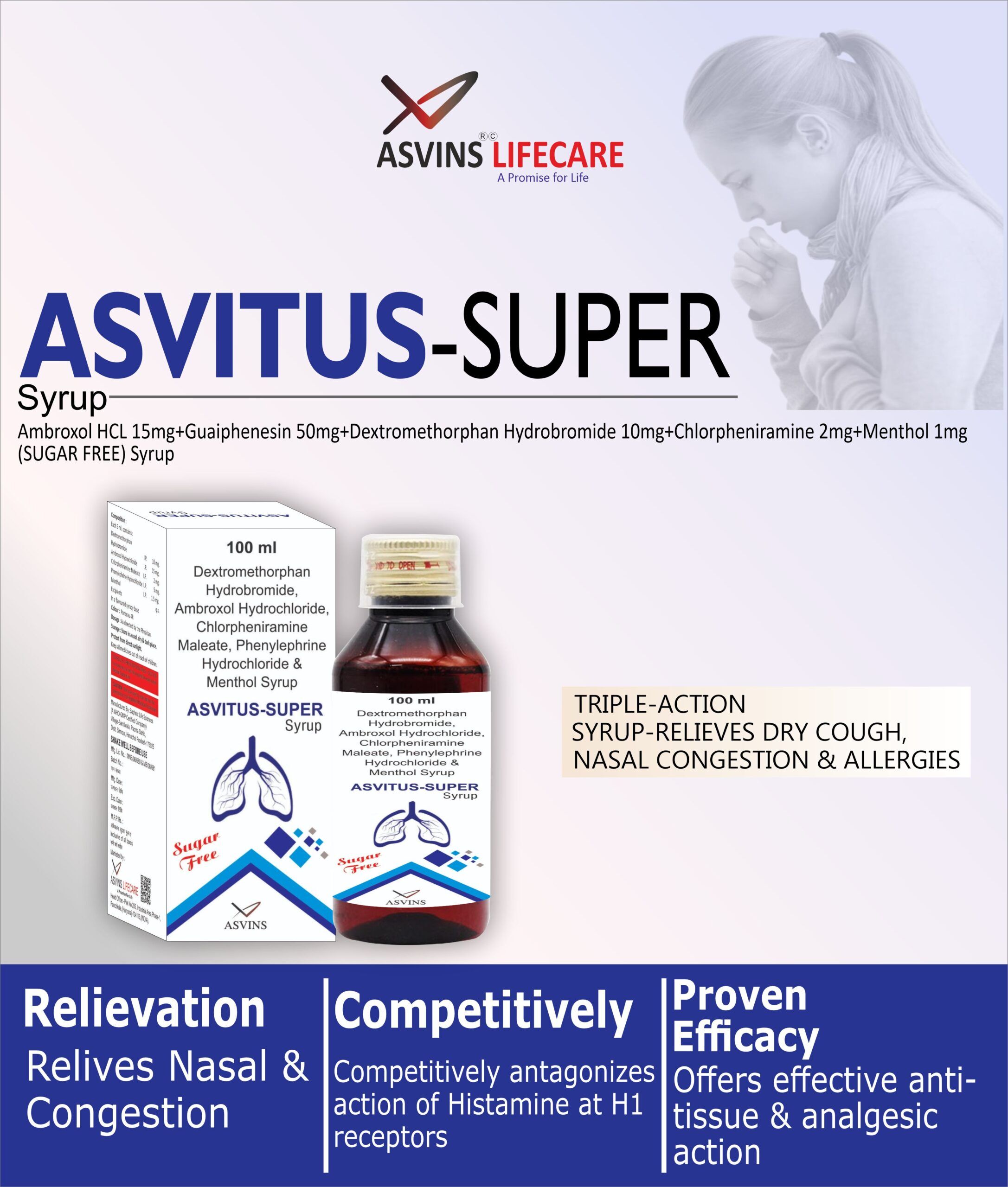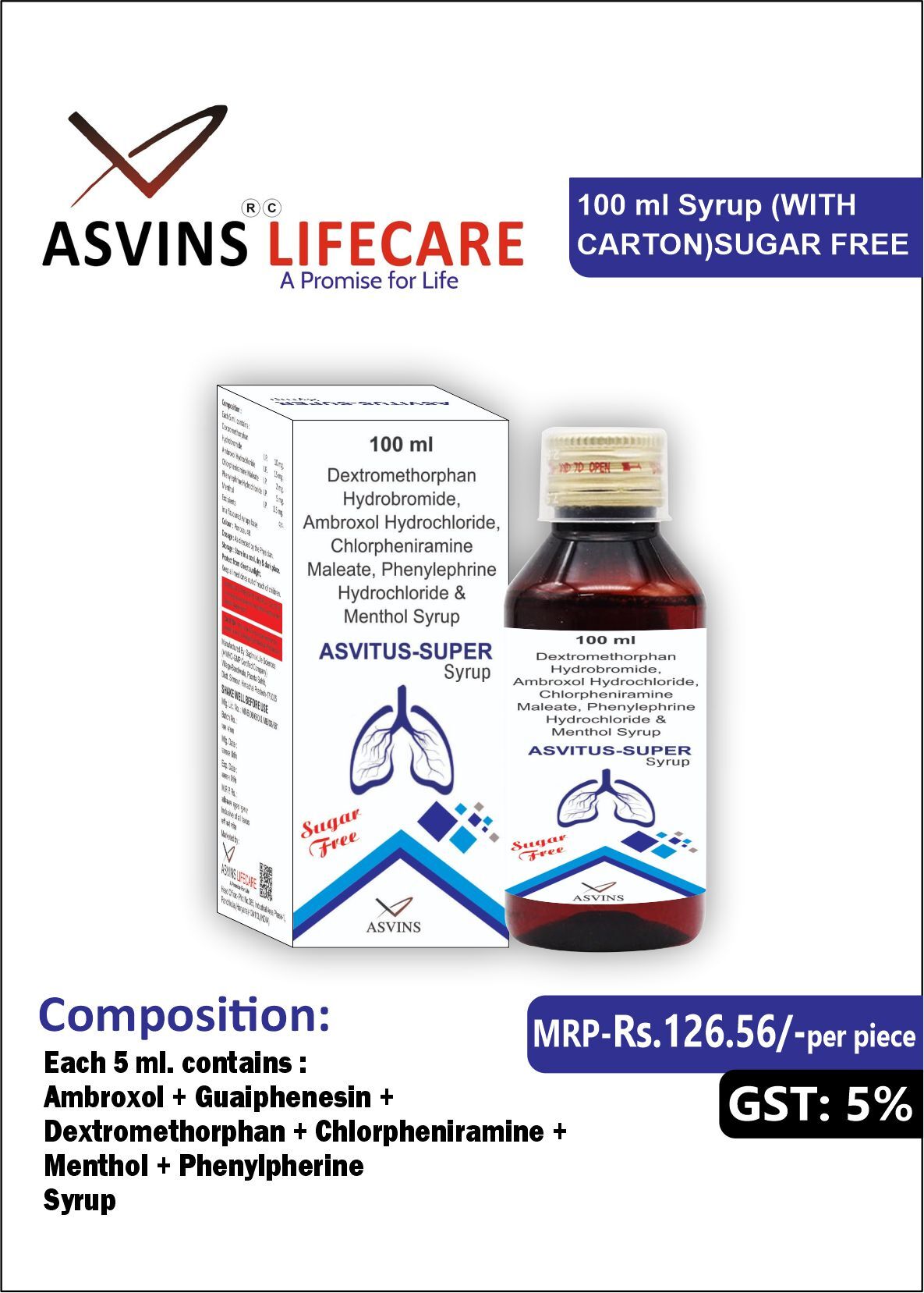 Ambroxol HCL 15mg+Guaiphenesin 50mg+Dextromethorphan Hydrobromide 10mg+Chlorpheniramine 2mg+Menthol 1mg (SUGAR FREE) Syrup