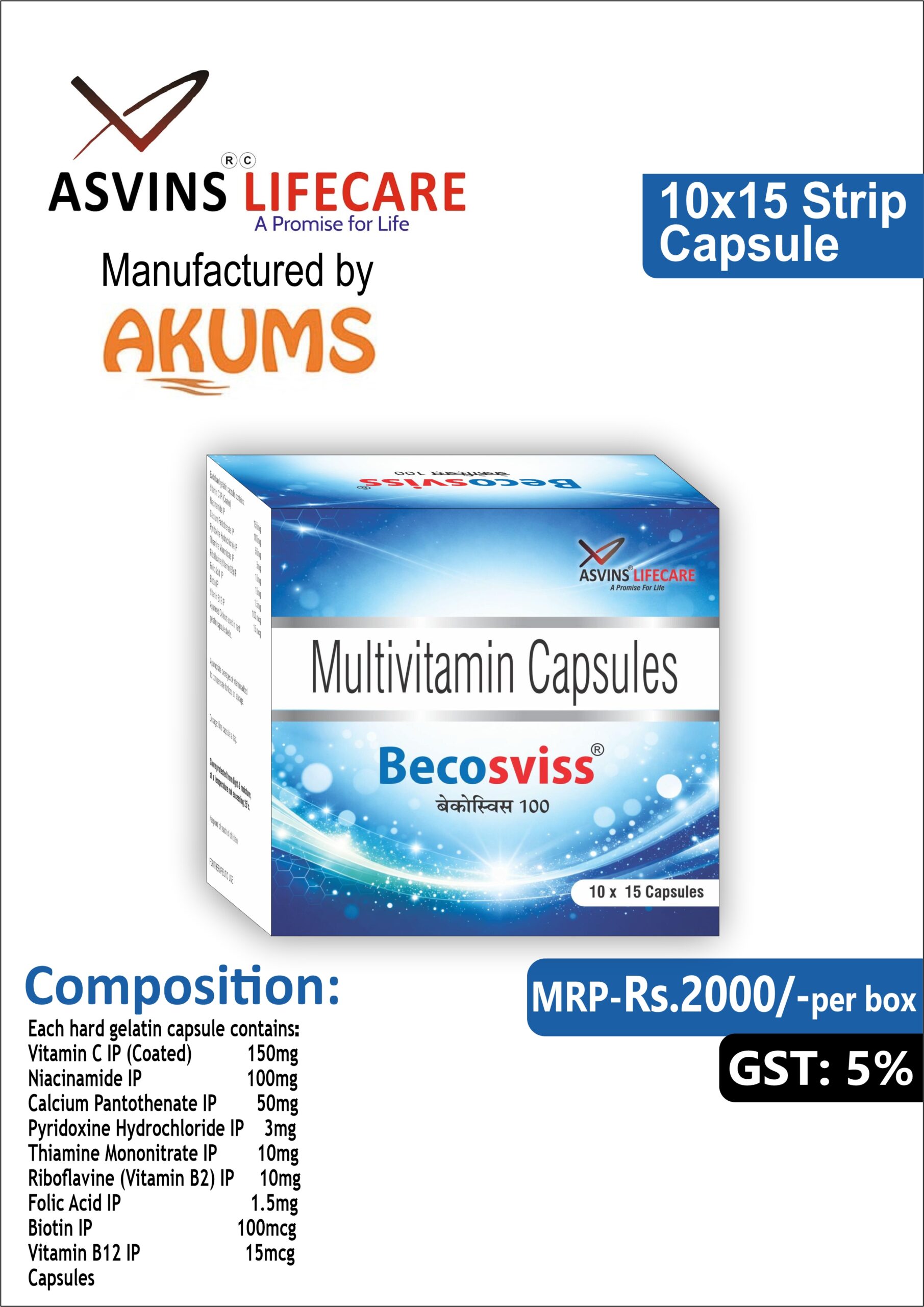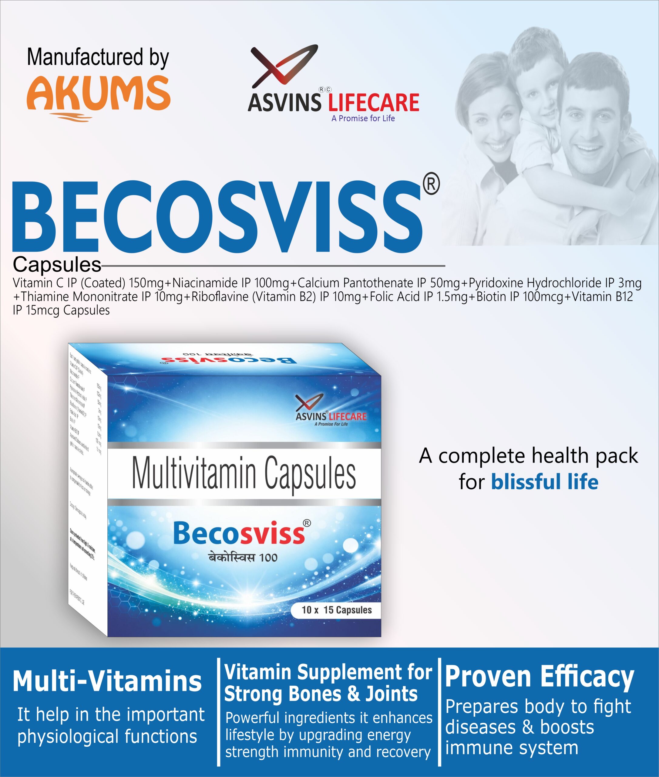 Vitamin C IP (Coated) 150mg+Niacinamide IP 100mg+Calcium Pantothenate IP 50mg+Pyridoxine Hydrochloride IP 3mg+Thiamine Mononitrate IP 10mg+Riboflavine (Vitamin B2) IP 10mg+Folic Acid IP 1.5mg+Biotin IP 100mcg+Vitamin B12 IP 15mcg Capsules
