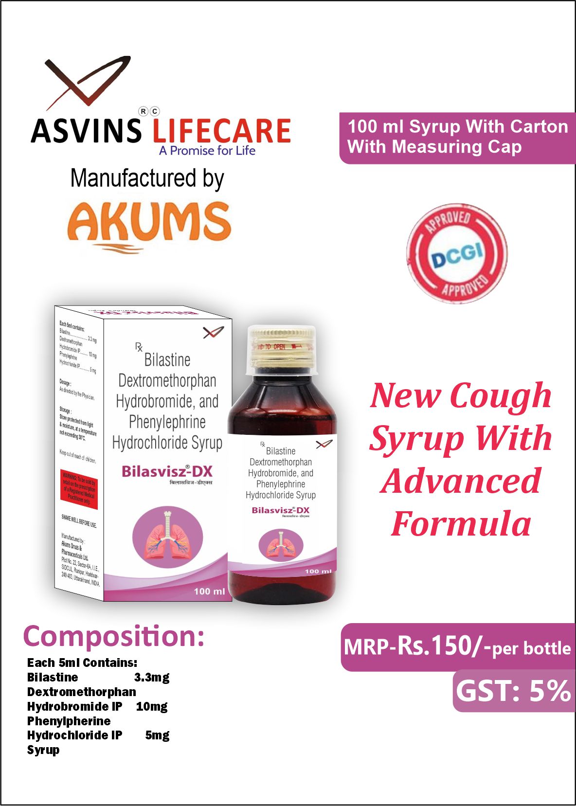 Bilastine 3.3mg+Dextromethorphan Hydrobromide 10mg+Phenylpherine Hydrochloride IP 5mg