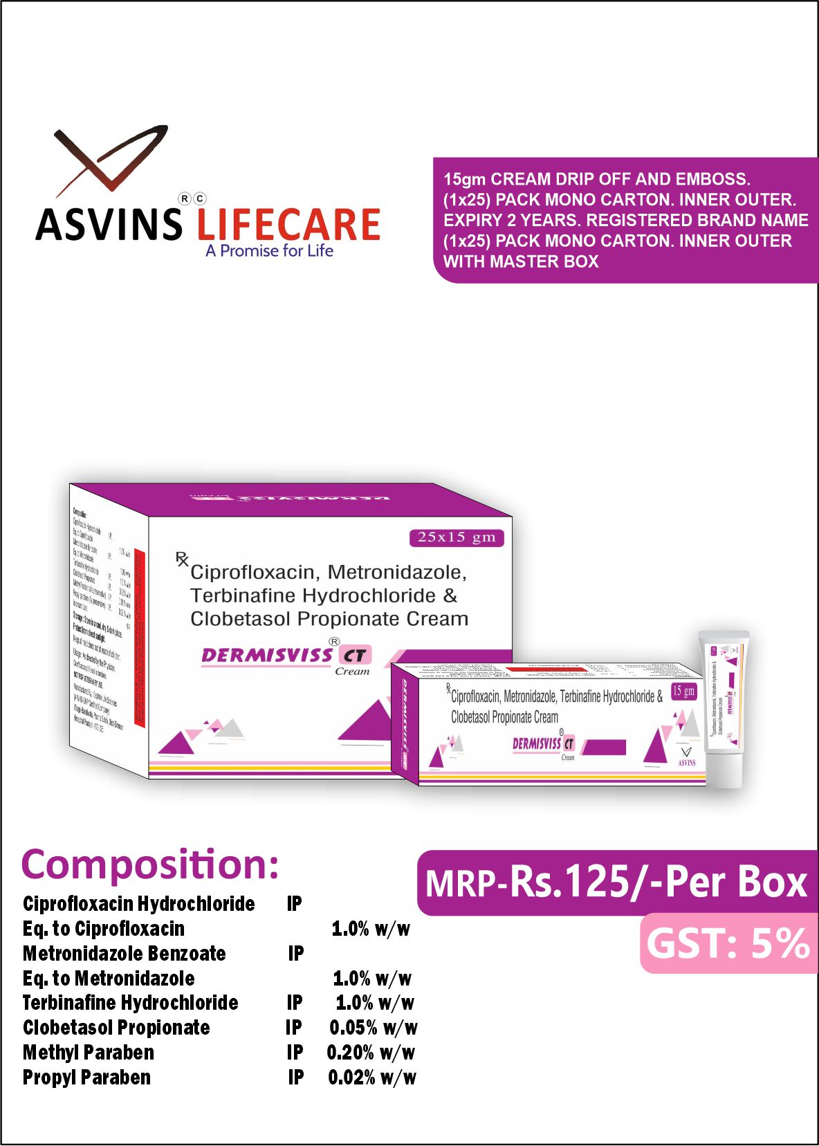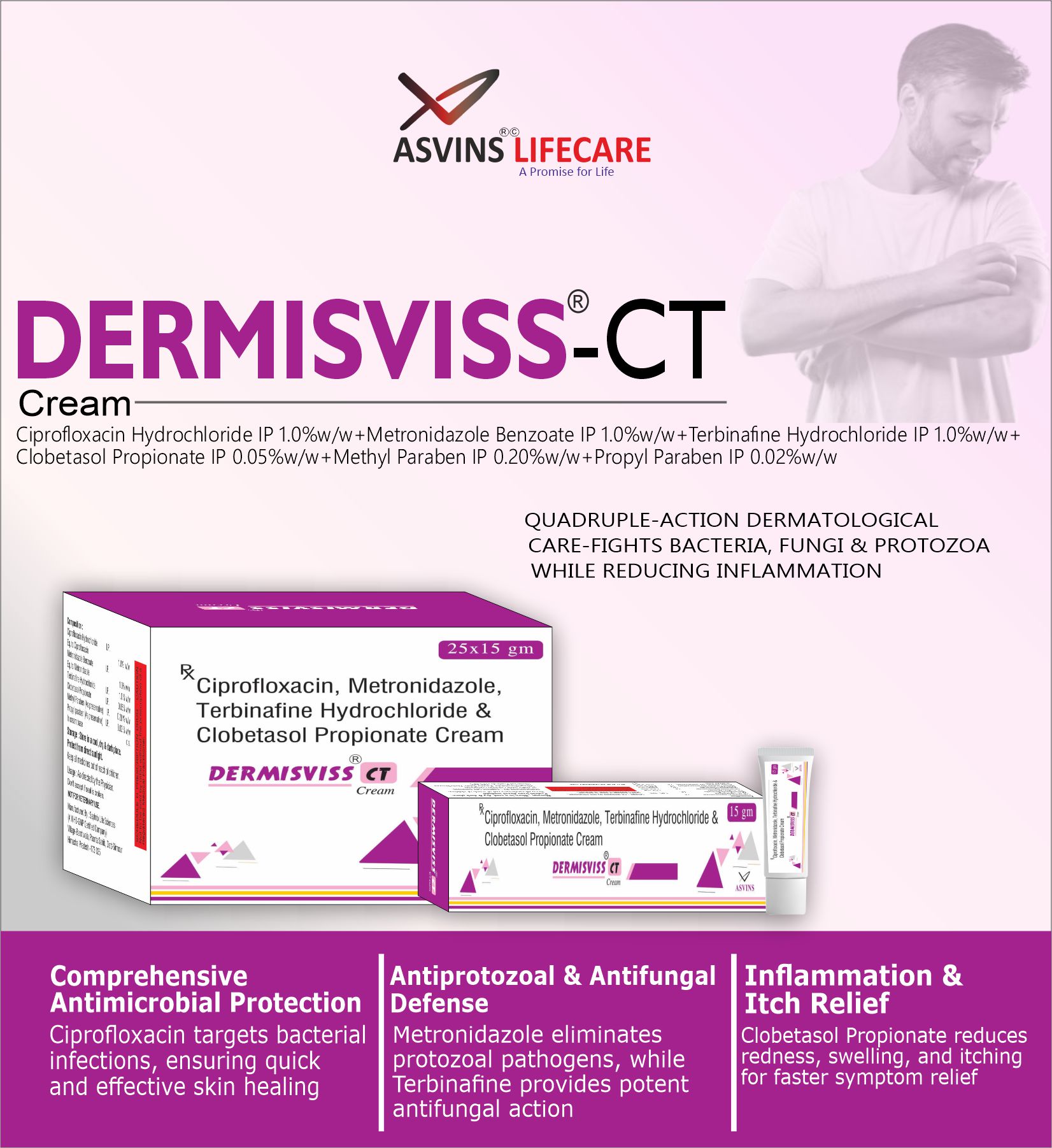 Ciprofloxacin Hydrochloride IP 1.0%w/w+Metronidazole Benzoate IP 1.0%w/w+Terbinafine Hydrochloride IP 1.0%w/w+Clobetasol Propionate IP 0.05%w/w+Methyl Paraben IP 0.20%w/w+Propyl Paraben IP 0.02%w/w