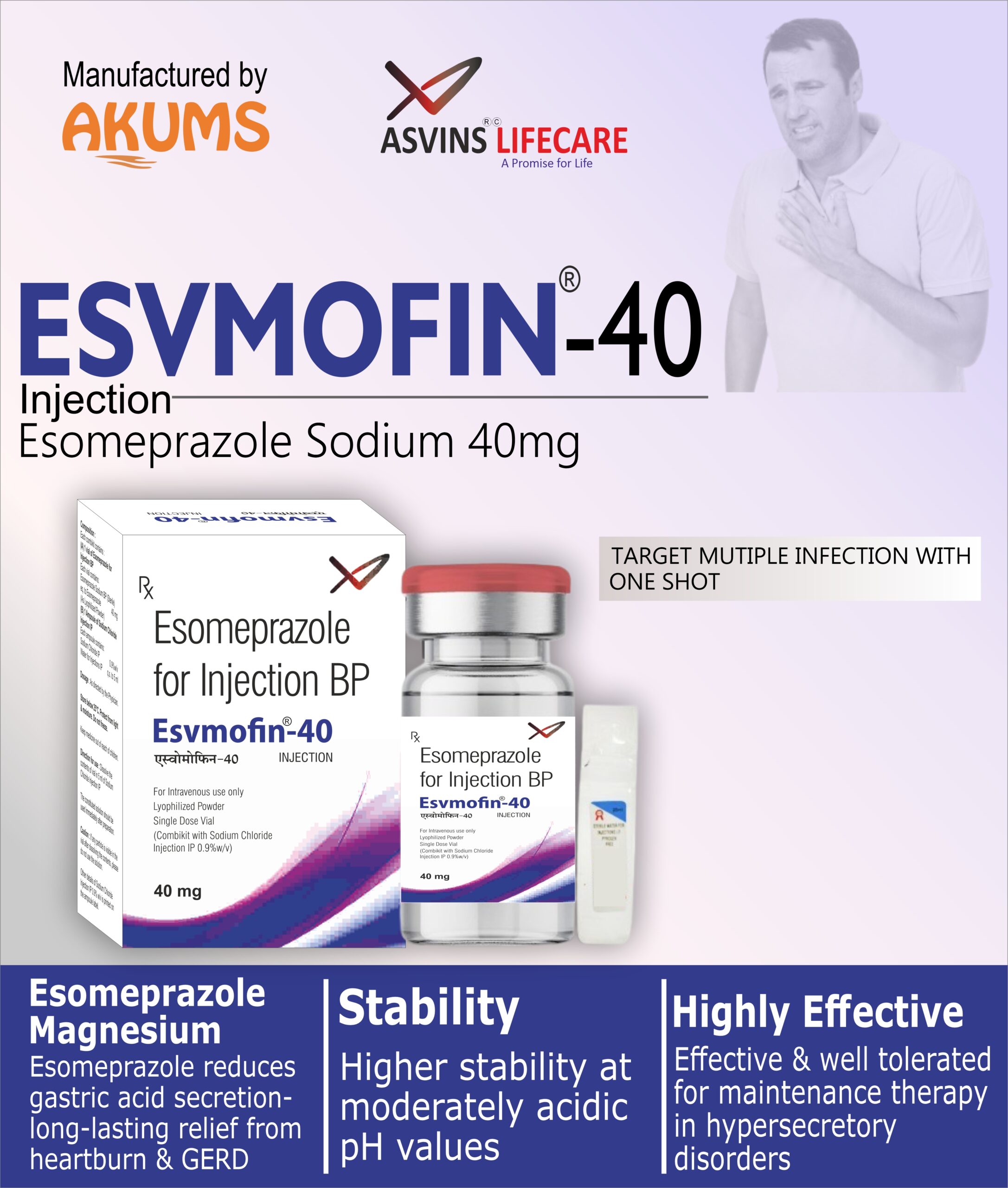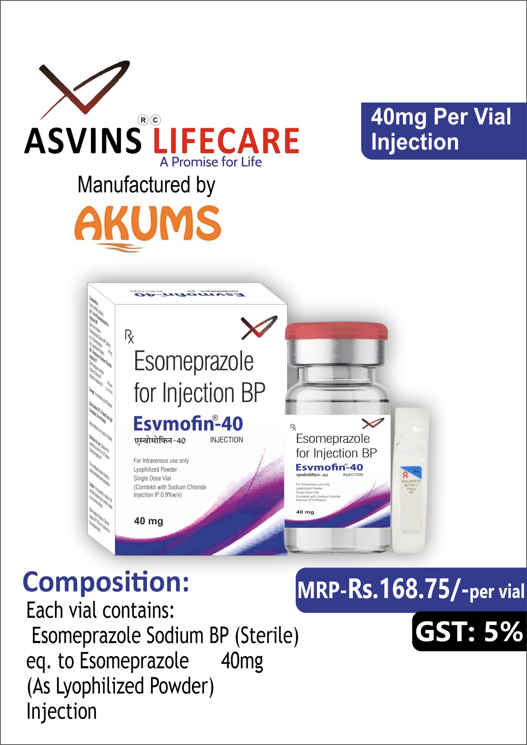 Esomeprazole Sodium Injection  – ESVMOFIN-40 Injection with Esomeprazole sodium (equivalent to Esomeprazole) injection as active ingredient comes in 40 mg powder for injection.