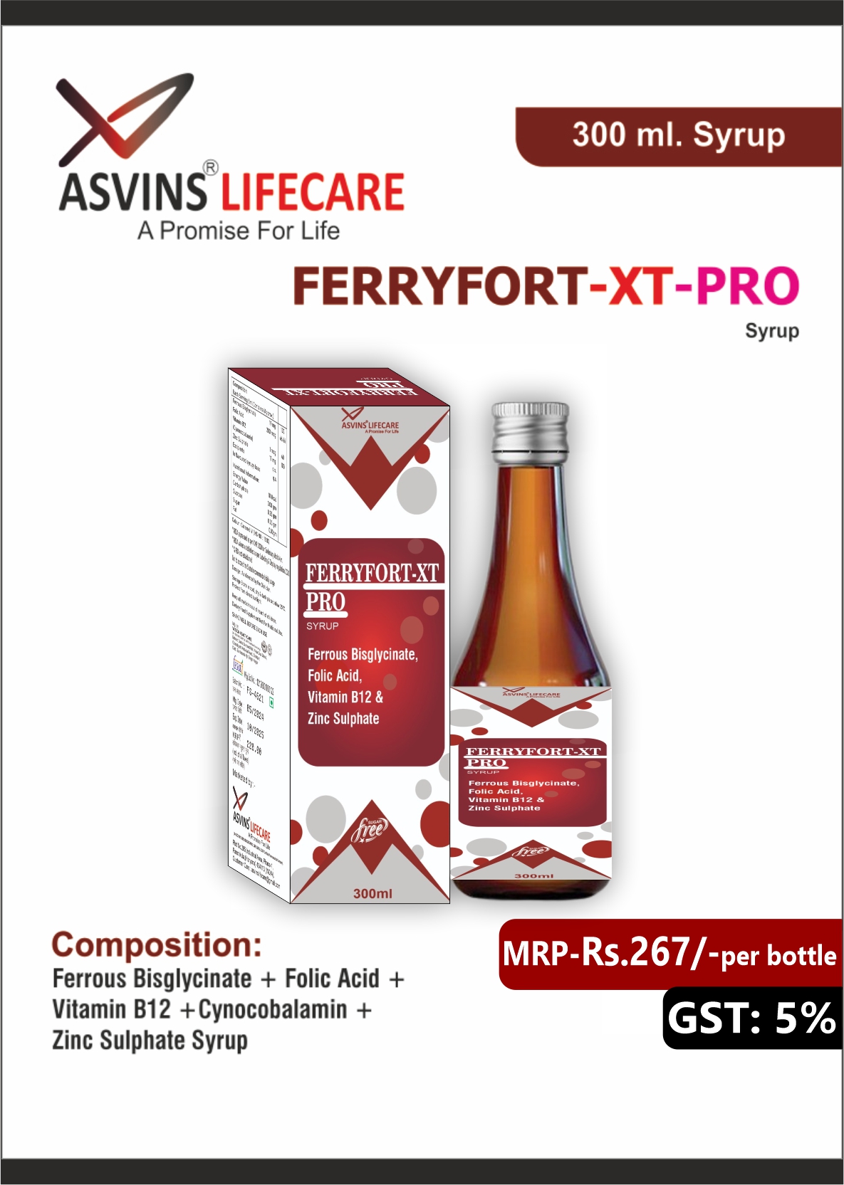 Ferrous Bisglycinate 19mg+Folic Acid 200mcg+Vitamin B12 1mcg+ Zinc Sulphate 17mg (SUGAR FREE) Syrup