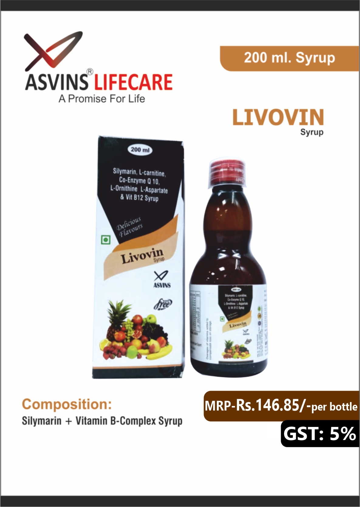LIVOVIN SYRUP—This syrup is a powerful liver protective and energy-boosting formula that contains the nutraceutical drugs like silymarin, L-ornithine L-aspartate, essential B-complex vitamins, coenzyme Q10, L-carnitine tartrate, and protein. Together, these ingredients support detoxification, energy production, and liver health and are good for overall metabolic function. It is a sugar-free syrup that makes it suitable for diabetic patients. This is helpful in conditions like fatty liver, alcoholic liver disease, hepatitis, and recovery after jaundice. This syrup is offered by the Asvins Lifecare for the PCD Pharma Franchise business in India.