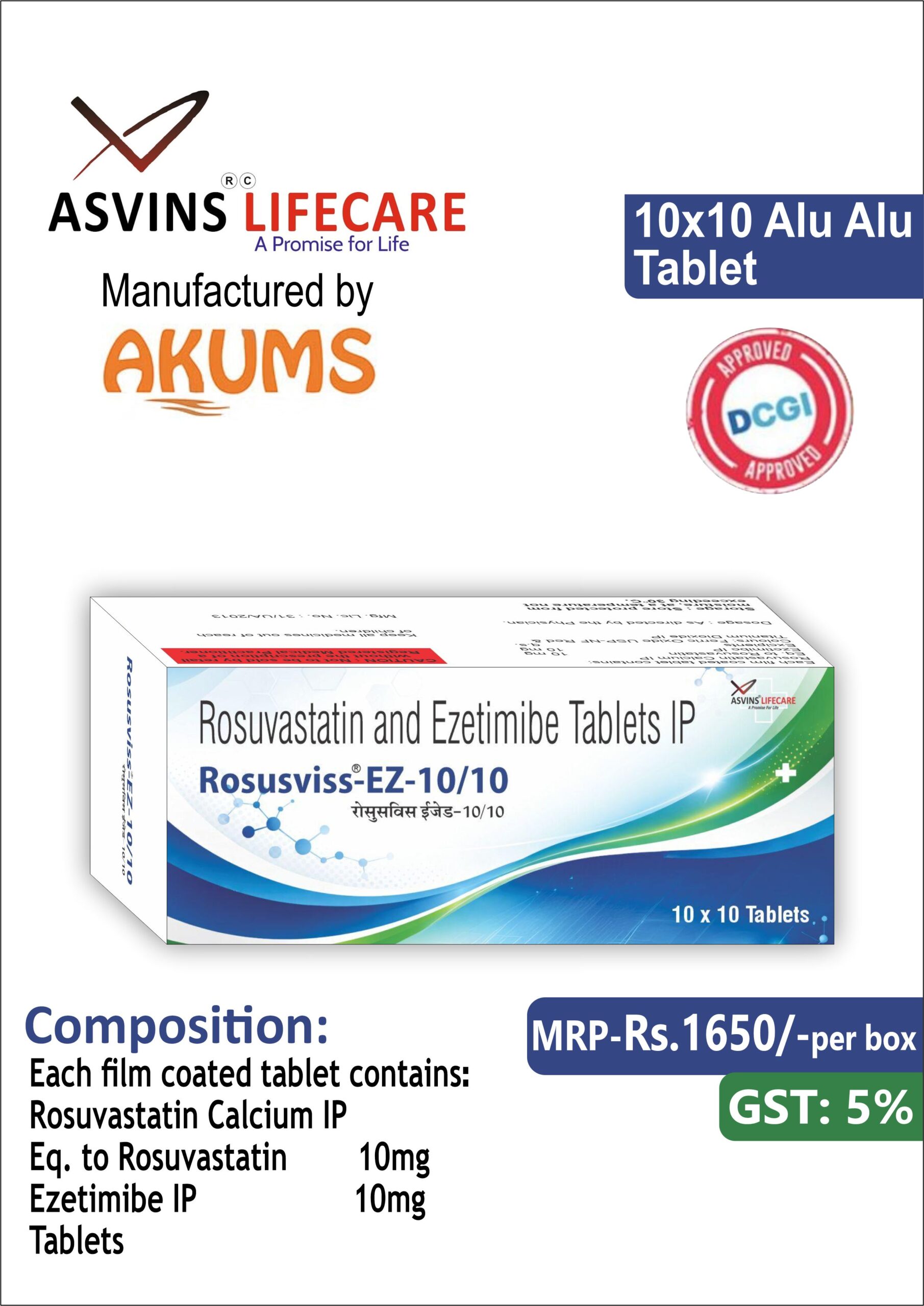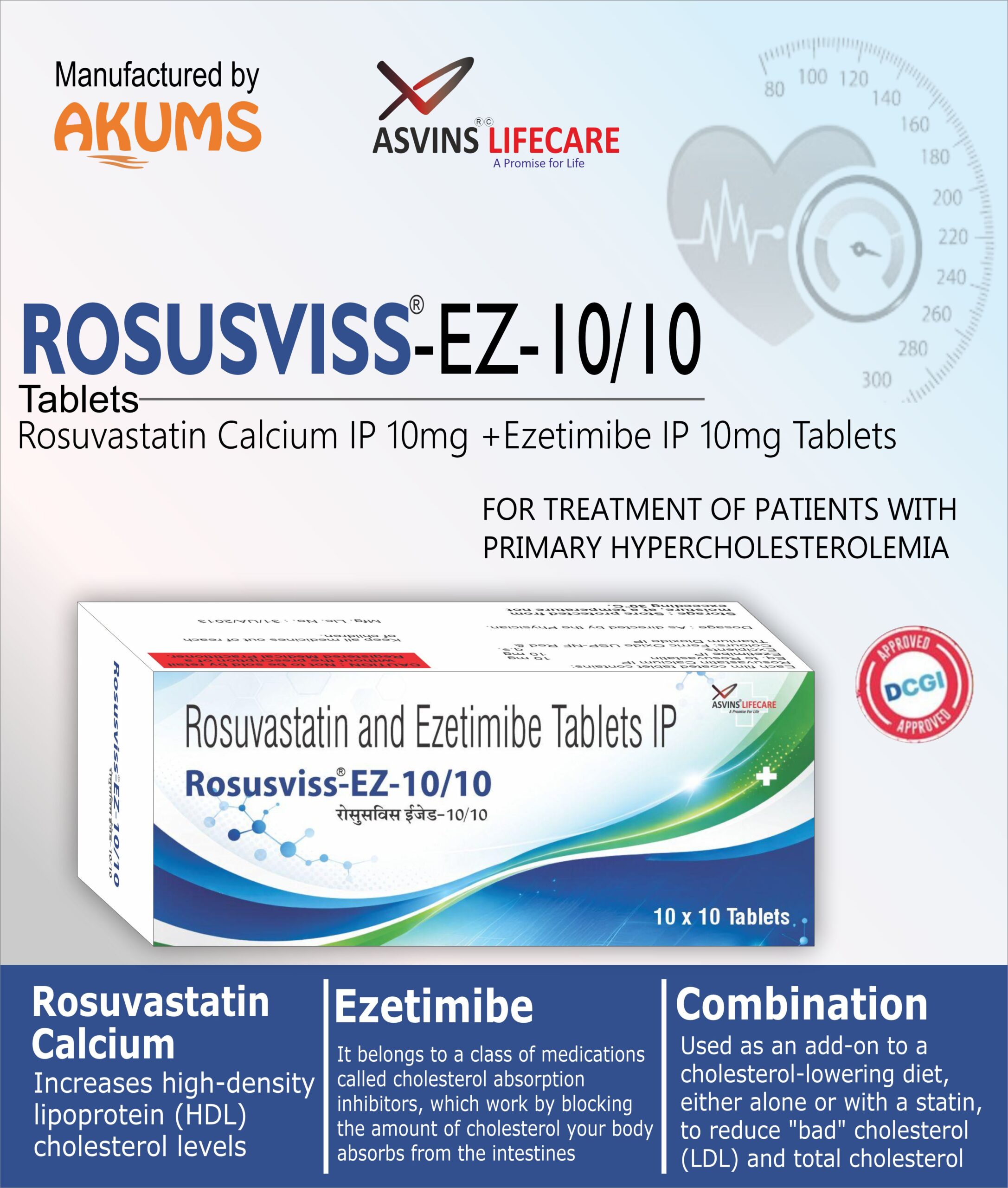 Rosuvastatin Calcium IP 10mg +Ezetimibe IP 10mg Tablets