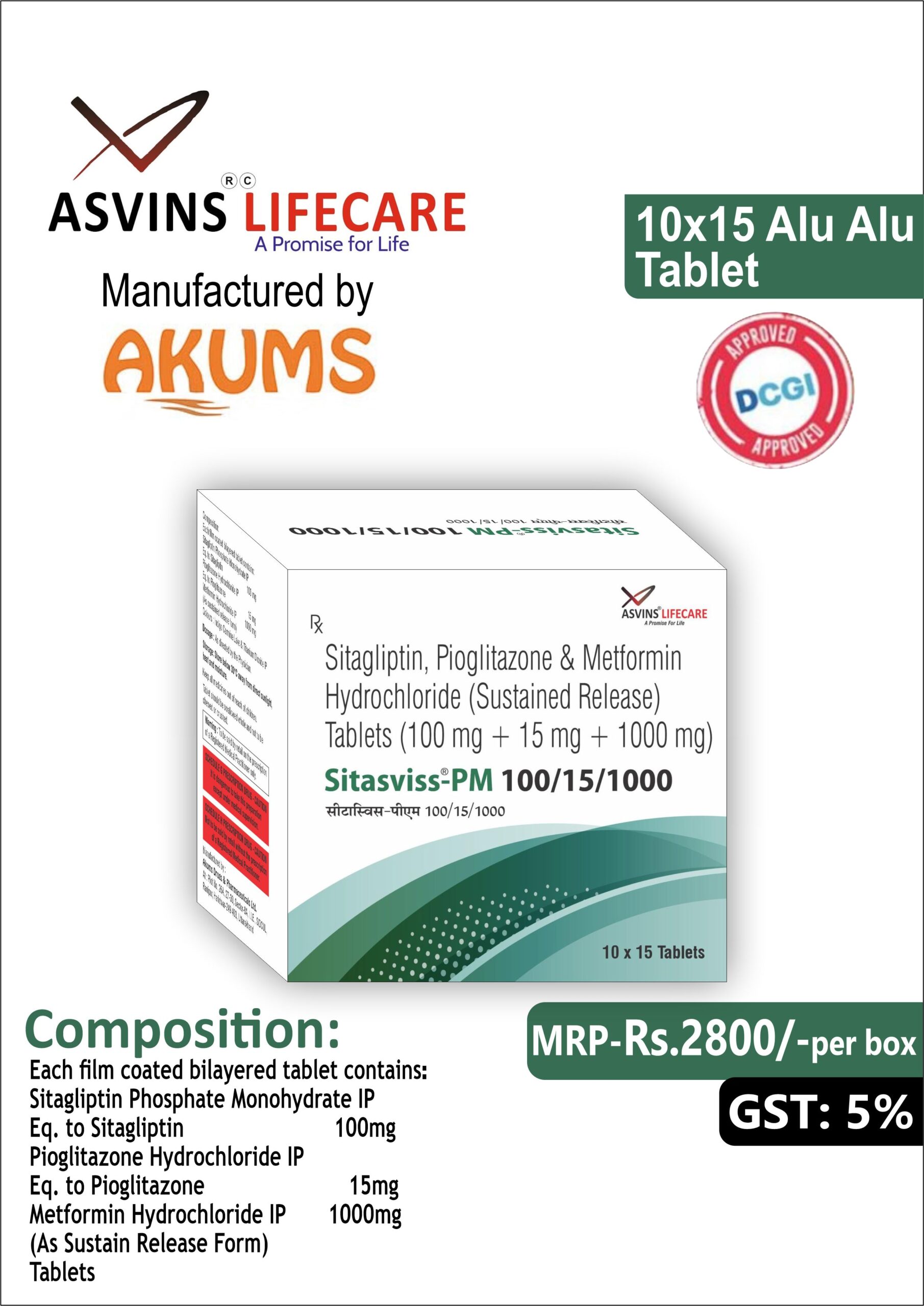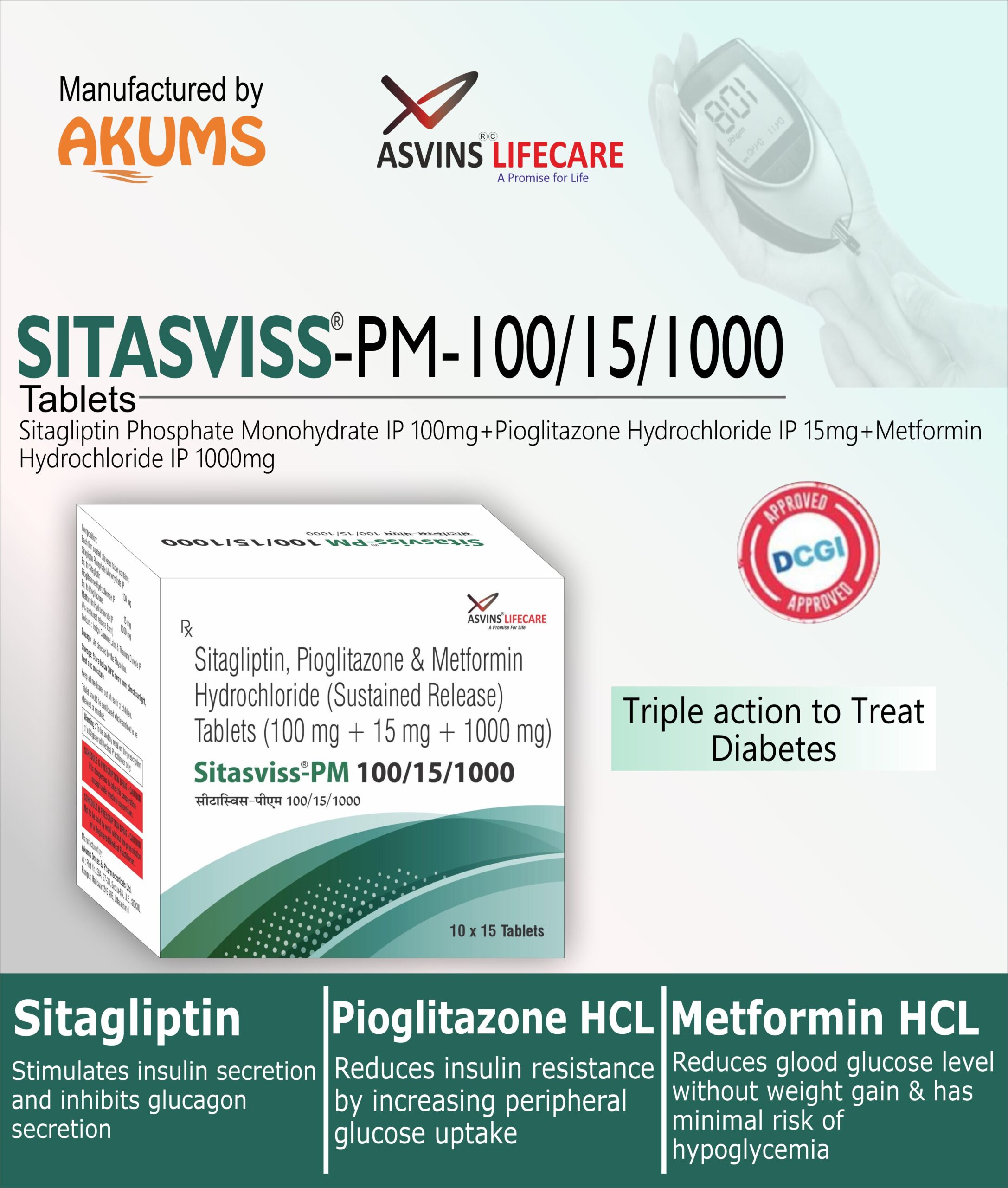 Sitagliptin Phosphate Monohydrate IP 100mg+Pioglitazone Hydrochloride IP 15mg+Metformin Hydrochloride IP 1000mg