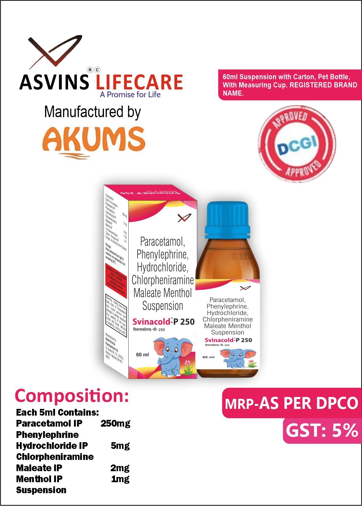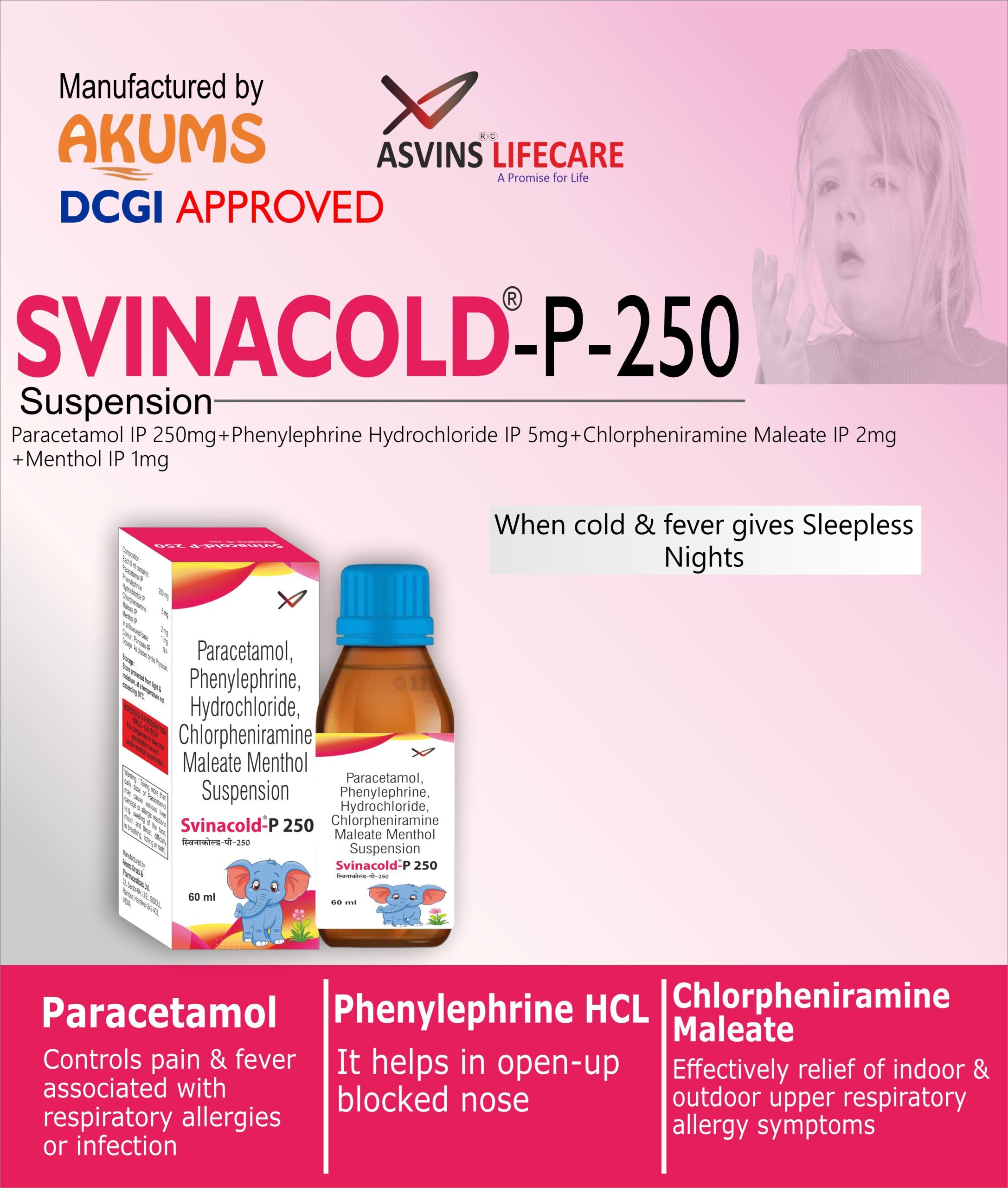 Paracetamol, Phenylephrine, Chlorpheniramine & Menthol Suspension – Svinacold P 250 is generally used to treat symptoms of common cold and allergies like sneezing, runny/stuffy nose, fever, headache, body pains, congestion, or watery eyes. The common cold is a respiratory illness that affects the nose and throat. It is mostly caused by viruses known as rhinovirus.