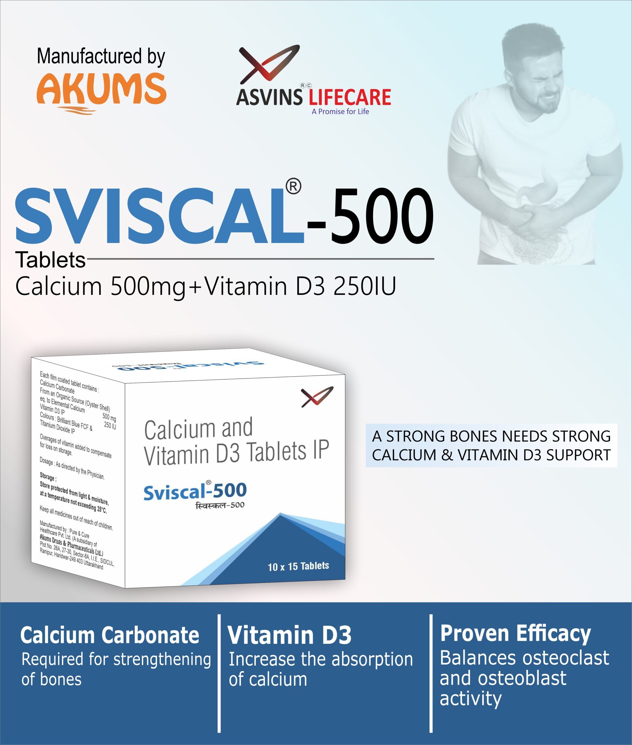 Calcium 500mg And Vitamin D3 250 IU Tablets – Calcium and vitamin D3 tablets are a class of ‘Nutritional supplements’ that is mainly employed in the treatment of low blood calcium. It also cures different ailments brought on by low levels of calcium in the body, including Vitamin D deficiency, osteoporosis (brittle and weak bones), hypoparathyroidism, latent tetany, and rickets or osteomalacia. Calcium is a nutrient for preventing or treating calcium deficiency. Calcium delivers essential nutrients to support bone formation and maintenance. Vitamin D3 supports blood calcium and phosphorus status and bone mineralization. It prevents and treats bone disorders, including rickets and osteomalacia.
