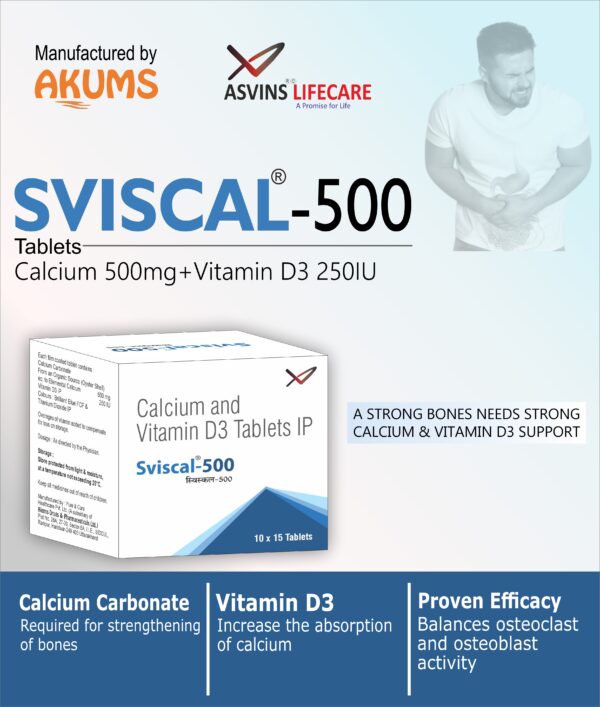Calcium 500mg And Vitamin D3 250 IU Tablets – Calcium and vitamin D3 tablets are a class of ‘Nutritional supplements’ that is mainly employed in the treatment of low blood calcium. It also cures different ailments brought on by low levels of calcium in the body, including Vitamin D deficiency, osteoporosis (brittle and weak bones), hypoparathyroidism, latent tetany, and rickets or osteomalacia. Calcium is a nutrient for preventing or treating calcium deficiency. Calcium delivers essential nutrients to support bone formation and maintenance. Vitamin D3 supports blood calcium and phosphorus status and bone mineralization. It prevents and treats bone disorders, including rickets and osteomalacia.