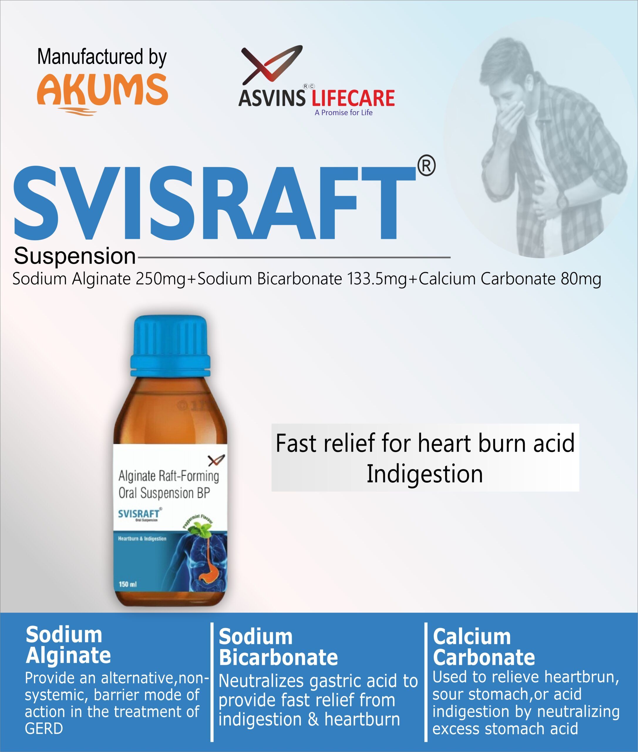 Sodium Alginate, Sodium Bicarbonate, Calcium Carbonate Oral Suspension – SVISRAFT Oral Suspension is made up of the drugs named Sodium Alginate, Sodium Bicarbonate, and Calcium Carbonate that are used in the treatment of heartburn and indigestion. Sodium alginate creates a sticky layer over what’s in the stomach, stopping acid from coming back up. Sodium bicarbonate and calcium carbonate are medicines that help calm stomach acid.