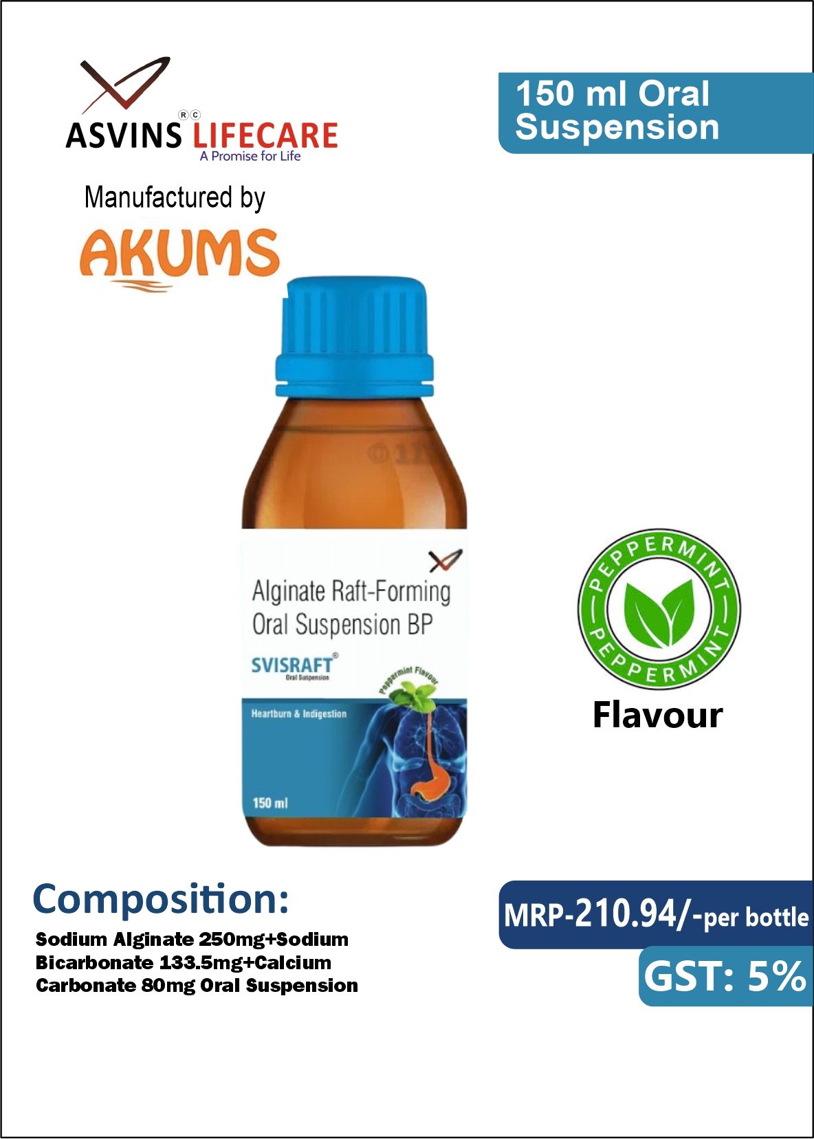 Sodium Alginate, Sodium Bicarbonate, Calcium Carbonate Oral Suspension – SVISRAFT Oral Suspension is made up of the drugs named Sodium Alginate, Sodium Bicarbonate, and Calcium Carbonate that are used in the treatment of heartburn and indigestion. Sodium alginate creates a sticky layer over what’s in the stomach, stopping acid from coming back up. Sodium bicarbonate and calcium carbonate are medicines that help calm stomach acids.