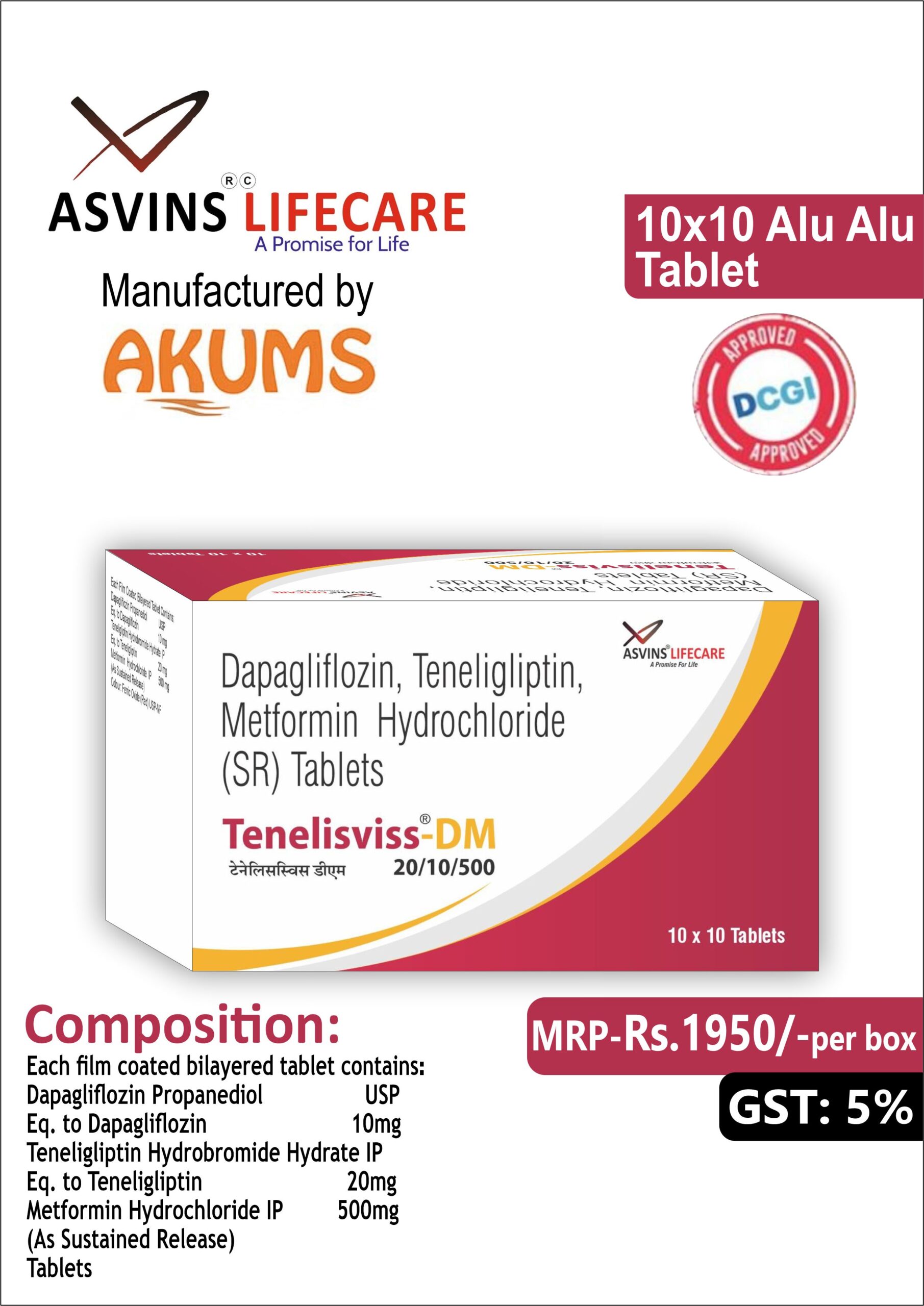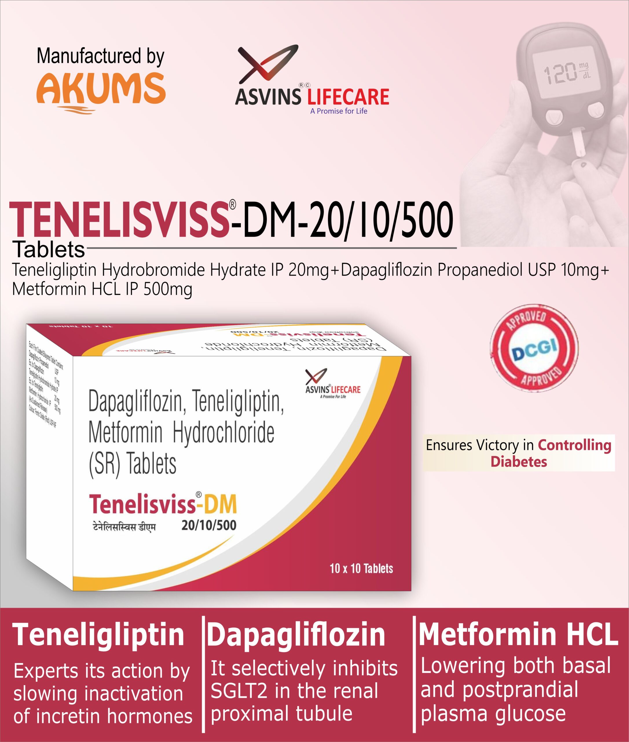 Teneligliptin Hydrobromide Hydrate IP 20mg+Dapagliflozin Propanediol USP 10mg+ Metformin HCL IP 500mg
