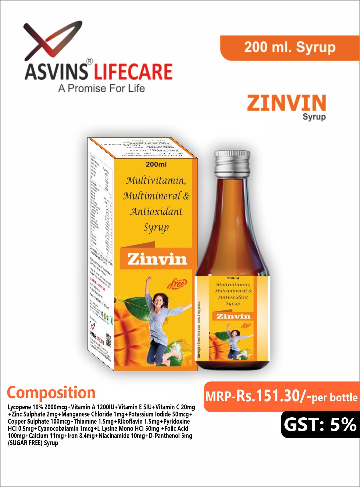 Lycopene 10% 2000mcg+Vitamin A 1200IU+Vitamin E 5IU+Vitamin C 20mg+Zinc Sulphate 2mg+Manganese Chloride 1mg+Potassium Iodide 50mcg+Copper Sulphate 100mcg+Thiamine 1.5mg+Riboflavin 1.5mg+Pyridoxine HCI 0.5mg+ Cyanocobalamin 1mcg+L-Lysine Mono HCI 50mg +Folic Acid 100mg+Calcium 11mg+Iron 8.4mg+Niacinamide 10mg +D-Panthenol 5mg (SUGAR FREE) Syrup